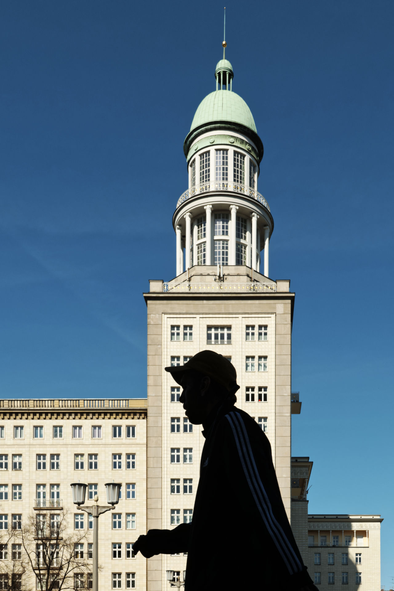 Voor deze foto heb ik me gefocust op cirkels. De ronde vorm van de Fernsehturm, van de toren links in beeld en van de wielen van de fiets. Vervolgens heb ik zo getimed dat de fietser precies tussen de twee torens inpast. Dat zijn pet matcht bij zijn fiets, maakt voor mij de foto af.